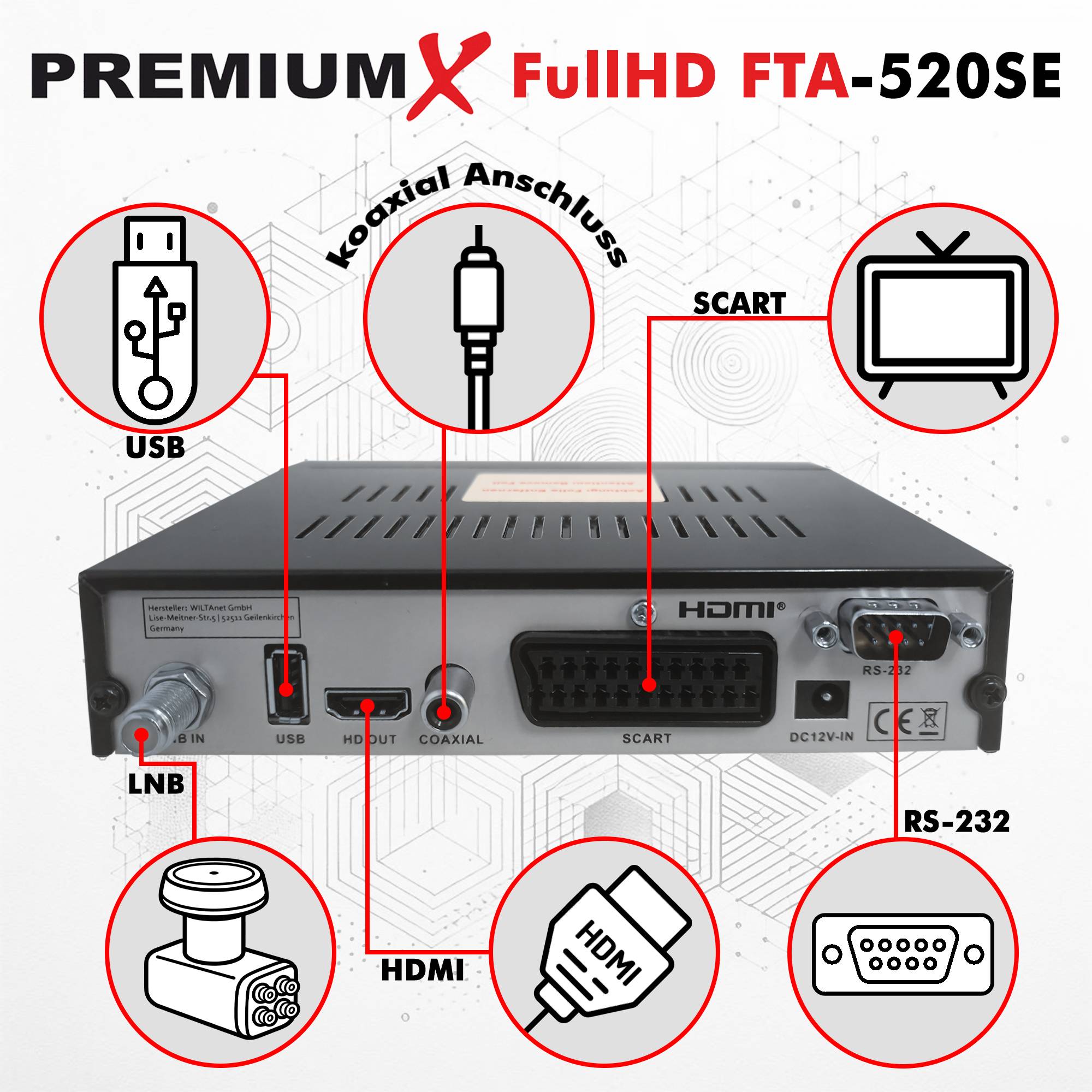 1x HD 520SE FTA Sat-Receiver, 1x Bedienungsanleitung DE, 1x Fernbedienung, 2x Batterie, 1x HDMI-Kabel