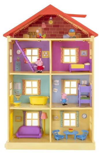 Peppa s Haus aus der Serie mit 4 Etagen! Sieben Räume zum Spielen: Schlafzimmer, Wohnzimmer, Küche, Badezimmer, Kinderzimmer, Büro und Dachboden. Inklusive 10 Zubehörteile und 2 beweglichen Figuren: Peppa und Schorsch. Kann horizontal oder vertikal platziert werden. Ab 3 Jahren.