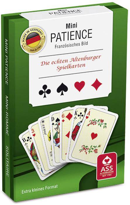 Patience, Solitaire oder Rommé - mit diesen Karten im Miniformat können die unterschiedlichsten Spiele gespielt werden. Patiencen legen gehört zu den beliebtesten Freizeitbeschäftigungen allein - mit 2 x 52 Blatt im Folienetui kann der Spaß losgehen. Ab 8 Jahre.