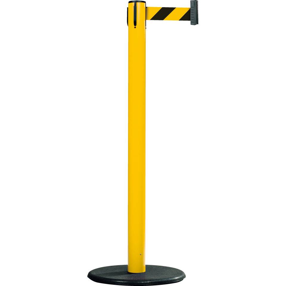 RS-GUIDESYSTEMS Sicherheits-Gurtpfosten Indoor, für den Innenbereich, mit Panikverschluss, Fußplatte des Pfostens gewährleistet eine hohe Standfestigkeit, mit Kunststoffabdeckung zum Schutz vor Kratzern und anderen Beschädigungen, Farbe Pfosten: gelb, Material: Kunststoff, Durchmesser: 65 mm, Höhe: ca. 990 mm, Gurtfarbe: gelb/schwarz schraffiert, Breite: ca. 50 mm, Länge: 4 m, Material Fußplatte: Gusseisen, Durchmesser: 350 mm, Höhe: 20 mm, Gesamtgewicht: 9 kg