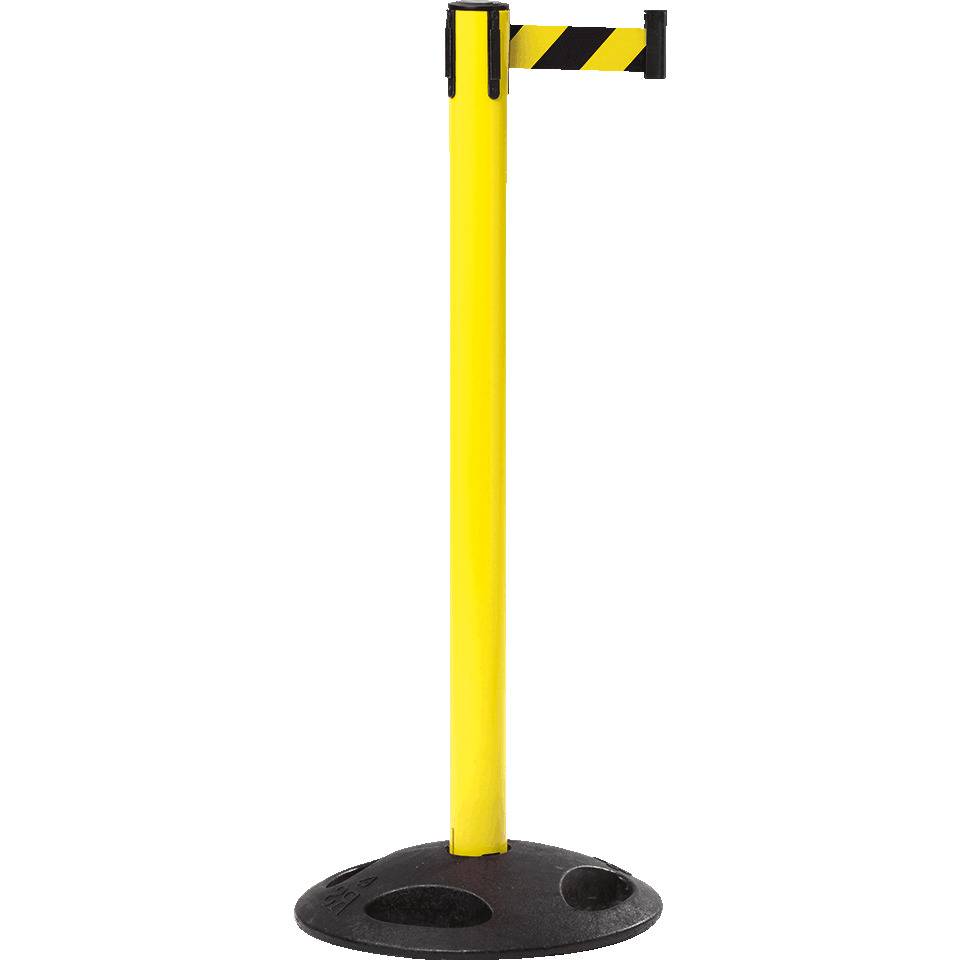 RS-GUIDESYSTEMS Sicherheits-Gurtpfosten Outdoor, mit überfahrbarem Bodenteller, für den Außenbereich, Farbe Pfosten: gelb, Material Pfosten: Kunststoff, Durchmesser: ca.65 mm, Höhe: ca. 990 mm, Gurtfarbe: gel/schwarz schraffiert, Breite: ca. 50 mm, Länge: 4 m, Material Bodenteller: Recycling-Material, Höhe: ca. 65 mm, Durchmesser: ca. 400 mm, Gesamtgewicht: ca. 8 kg