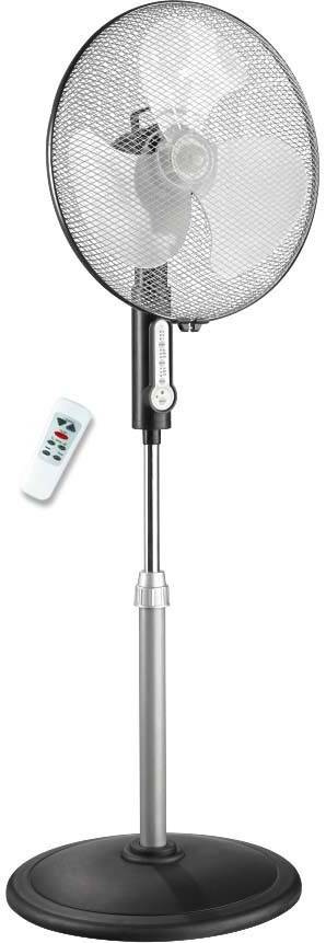 Gehäuse und Flügelrad aus schlagzähem, Kunststoff, Flügelrad halbtransparent, Drehzahl max. 1145 U/Min., 90° Oszillation (abschaltbar), 3 Stufen, schaltbar über elektronische Softschalter, 3-blättriges, optimiertes Flügelrad, Korbneigung vertikal einstellbar, LED-Anzeige der Funktionen, Standrohr höhenverstellbar von 1140-1335 mm, Kabellänge 1,8 m mit Euro-Flachstecker, Schutzkorb demontierbar, Gehäuse: Anthrazit mattiert, silber abgesetzt, Gewicht: 5,7 kg