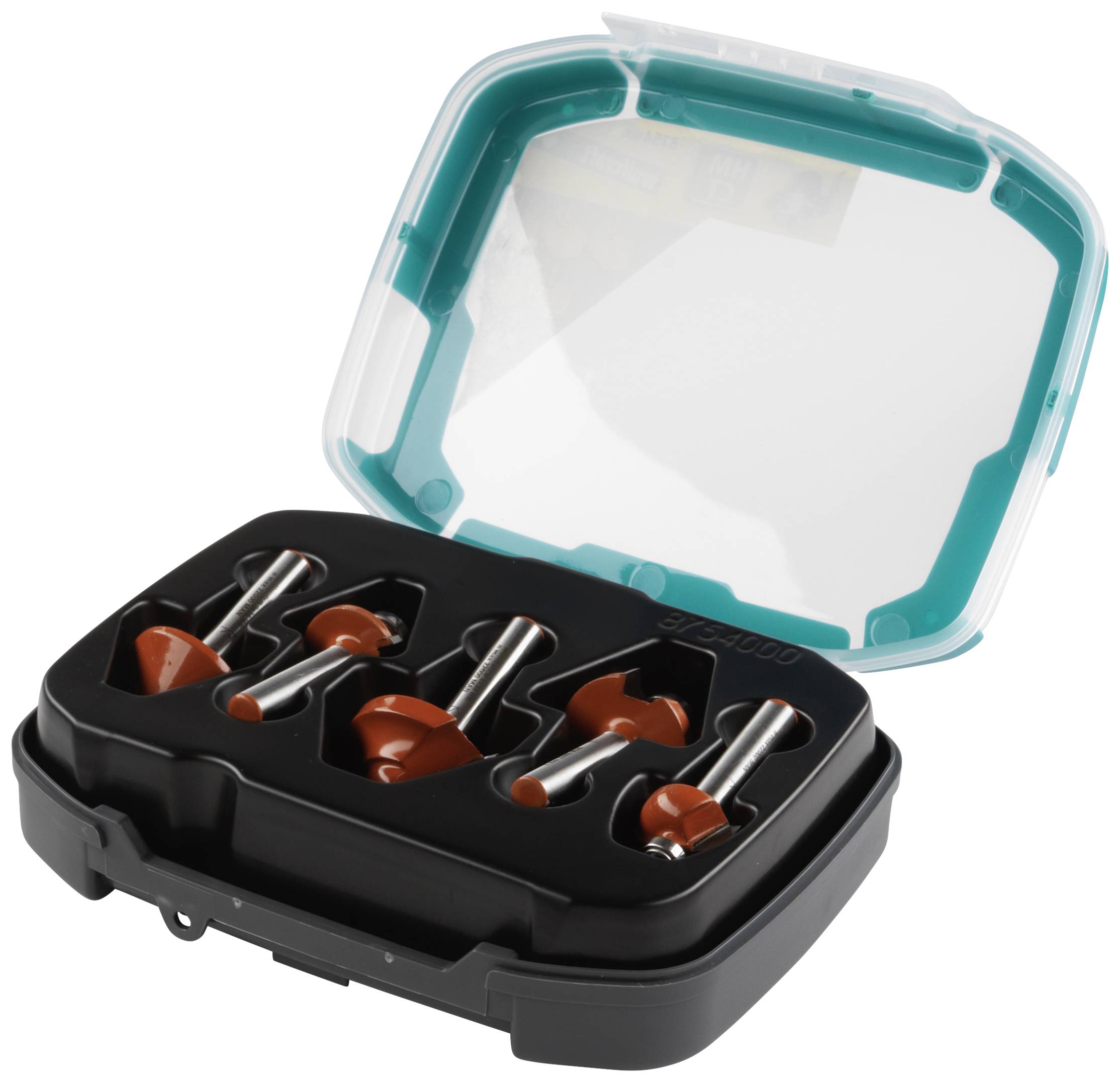 • 1 Halb-Hohlkehlfräser Ø 22 x 9,5 mm, r 6,5 mm, 1 Fasefräser Ø 31 x 12,5 mm, 45°, 1 Abrundfräser Ø 25 x 11 mm, r 6,5 mm, 1 Abrundfräser Ø 31 x 16 mm, r 9,5 mm, 1 Profilfräser Ø 38 x 19 mm, r