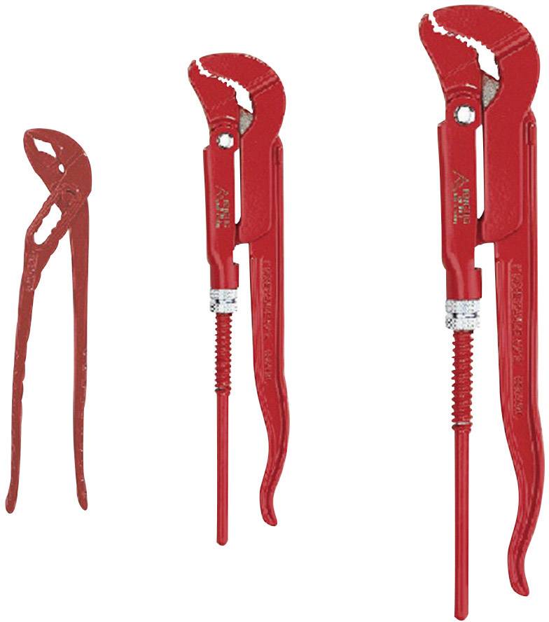 Eckrohrzange 45° „S“-Maul 1“: DIN 5234 Form C, Länge 315 mm, Griffweite: 0-42 mm · Eckrohrzange 45° „S“-Maul 1,5“: DIN 5234 Form C, Länge 420 mm, Griffweite: 0 – 60 mm · Wasserpumpenzange: Länge 240 mm.