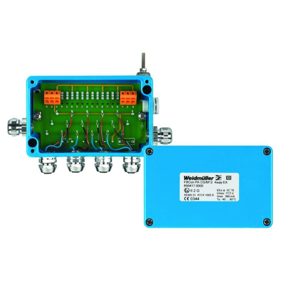 Standardverteiler für Den Ex-Bereich Eex(Ia). Standardverteiler für den Ex-Bereich EEx(ia), 4-fach Verteiler EEx, IP 66. Die Feldbusverteiler FBCon sind in Industrie und EEx (ia) Ausführung verfügbar. Sie dienen zur Kopplung von 1 – 8 Feldgeräten oder Sensoren. Die Verbindung erfolgt über Stichleitungen. Der Anschluss der Stichleitung ist wahlweise als M12 Steckanschluss oder direkt über eine EMV-Kabelverschraubung möglich. Die Kommunikation und die Gerätespeisung wird über eine gemeinsame 2-adrige Leitung geführt. Die Verteiler bieten abhängig von der Ausführung folgende Eigenschaften: Zugfederanschlusstechnik. Mit Überspannungsschutz für die Hauptleitung. Mit Strombegrenzung (Limiter) für jede Stichleitung. EMV-Kabelverschraubung. M12 Steckverbinder. Außenliegender Erdanschluss. Unterbrechungsfreier Busbetrieb . Industrie-Ausführung. Busabschluss integriert (Nicht EX). EX-Ausführung ATEX. Druckausgleichselement, Schutzarten IP65, IP66, IP67. Edelstahlausführung, PROFIBUS-PA kompatibel.