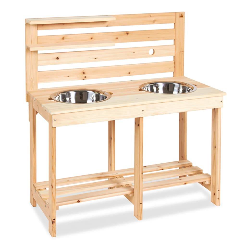 Diese Kinder-Schlammküche umfasst zwei Waschschüsseln aus Edelstahl und ein Loch für den Gartenschlauch in der Rückwand. Sie ist aus massivem, unbehandeltem Tannenholz gefertigt. Die kleinen Eimer und andere kleine Werkzeuge können an den Holzstangen an der Rückwand aufgehängt oder auf das untere Ablagefach gelegt werden.