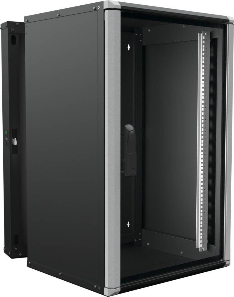 BASIC Aluminium Hybrid Wandschrank 18HE. 600x600x934 mm (BxTxH) bestehend aus Rückteil, schwenkbarem Gehäuse und Glastür. Grundrahmen aus Aluminium- und Stahlblech. Vordertür aus Einscheibensicherheitsglas ( ESG ), eingefasst in ein Aluminiumprofil rechts und links mit Schwenkhebelgriff zur Aufnahme eines Schließzylinders oder DIN Profilhalbzylinders. Integriertes Schnellverschluss-System ermöglicht die schnelle werkzeuglose Demontage der Tür. Türöffnungswinkel 180°, Türanschlag wahlweise links oder rechts möglich. Montagelöcher zur Wandbefestigung hinten. Seitenwände aus Stahlblech Rückteil 100mm tief mit Cut Outs zur Kabeldurchführung oben, unten und hinten, inkl. Bürstenleiste. Schwenkteil 500mm tief mit Cut Outs für Lüfterpaket ( FPME ) oder Ventilationsplatte ( VPE ). 19 Zoll Befestigungsebene (482,6 mm) 18 HE mit Lochraster nach IEC 60297-1 u. 2, vorne auf 4 multifunktionalen Tiefenstreben mit Markierungen zur präzisen Position der 19 Zoll-Profile im Schrank montiert. Kennzeichnung der Höheneinheiten ( HE ) vorn, von unten und oben beginnend mit 1 durchnummeriert und ablesbar. 19 Zoll Lochraster 18 HE im hinteren Bereich des Schwenkteils integriert, zur Montage von z.B. Kabelabfangschienen oder anderem Zübehör. Zentraler Erdanschluss. Schutzart IP 20. Bodenaufstellung ist möglich. Oberflächenbehandlung: Strukturlack ENOC System Schwarz RAL 9005