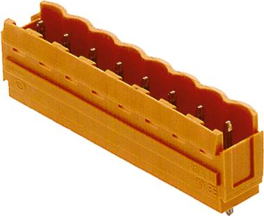 Leiterplattensteckverbinder. Stiftleiste, Schwalbenschwänze für Befestigungsblöcke, Lötanschluss, 5,00 mm, Polzahl: 24, 180 °, Lötstiftlänge: 3,2 mm, verzinnt, orange, Box. 400 V (IEC) / 300 V (UL), 18 A (IEC) / 15 A (UL).