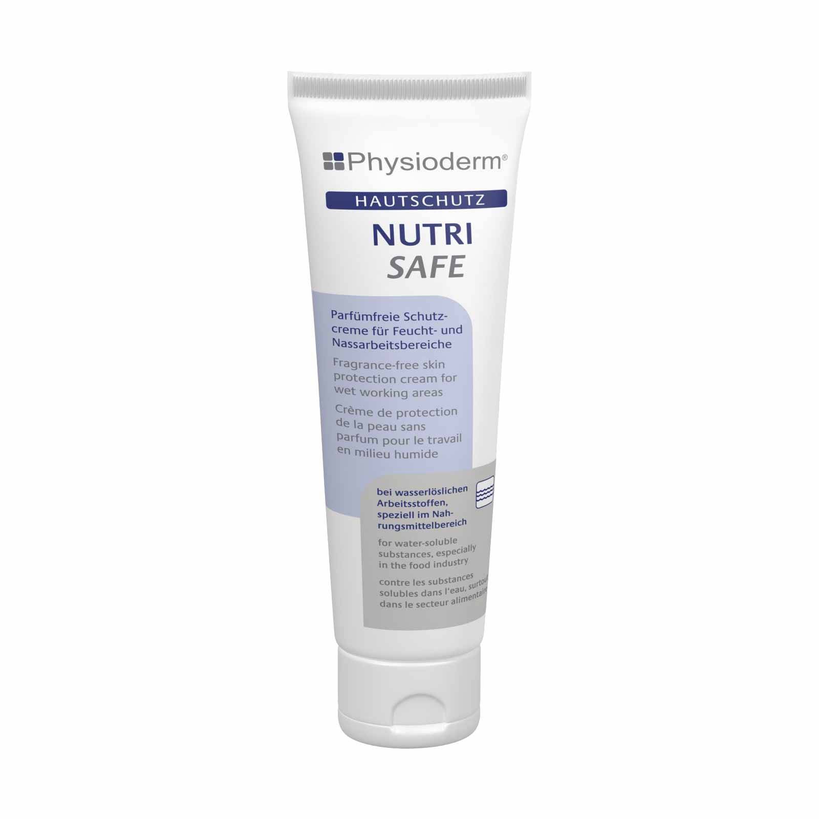 Die wasserfeste und parfümfreie Hautschutzcreme NUTRI SAFE ist lebensmittelecht und schützt die Haut vor wässrigen und wassermischbaren Arbeitsstoffen. Die Creme enthält Lipide aus pflanzlichen Ölen sowie pflegendes Vitamin E. Die schnell einziehende Schutzcreme wird beim Umgang mit z. B. wässrigen und wassermischbaren Lebensmitteln, Reinigungs- und Desinfektionsmitteln sowie verdünnten Säuren, Laugen oder Alkoholen eingesetzt. NUTRI SAFE ist besonders für den Lebensmittelbereich geeignet, da alle Inhaltstoffe als Lebensmittel z. B. Pflanzenfette (essbare Fette) bzw. Lebensmittelzusatzstoffe wie Lebensmittelemulgatoren und Lebensmittelkonservierungsmittel zugelassen sind. Die Hautcreme ist ohne synthetische Farbstoffe, paraben-, silikon- sowie mineralölfrei. Da sie keine Duftstoffe enthält, werden Geruchsbeeinflussungen von Lebensmitteln verhindert. NUTRI SAFE ist HACCP-konform.