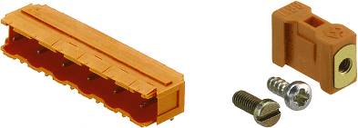 Leiterplattensteckverbinder. Stiftleiste, Schwalbenschwänze für Befestigungsblöcke, Lötanschluss, 7,62 mm, Polzahl: 12, 90 °, Lötstiftlänge: 3,2 mm, verzinnt, orange, Box. 800 V (IEC) / 300 V (UL), 18,5 A (IEC) / 15 A (UL).