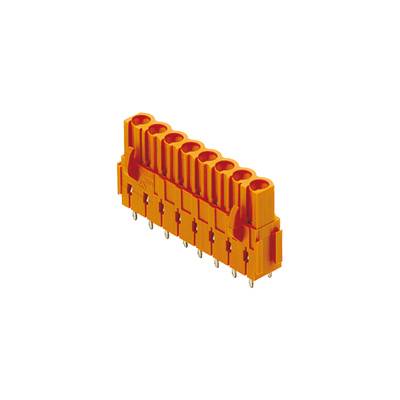 Leiterplattensteckverbinder. Buchsenleiste, Schwalbenschwänze für Befestigungsblöcke, Lötanschluss, 5,08 mm, Polzahl: 21, 180 °, Lötstiftlänge: 3,2 mm, verzinnt, orange, Box. Die Lötstiftlänge ist für Wellenlötanwendungen optimiert. 400 V (IEC) / 300 V (UL), 23 A (IEC) / 15 A (UL).