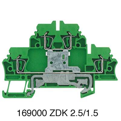 Schutzleiter-Reihenklemme, Doppelstock-Reihenklemme. Z-Reihenklemme mit Zugfederanschluss, Bemessungsquerschnitt: 2,5 mm², Zugfederanschluss, Wemid, grün / gelb, Direktmontage. Reihenklemmen in Zugfedertechnik, die Z-Reihe, sind speziell auf Kundenanforderungen zugeschnitten: Geringer Bauraum, großzügige Markierungsflächen, integrierter Prüfabgriff, Querverbindbarkeit innerhalb der Z-Reihe und zu weiteren Weidmüller Reihenklemmenfamilien. Die Klemmen der Z-Reihe verfügen über einen großen Klemmbereich und bis zu zwei Querverbindungskanäle.