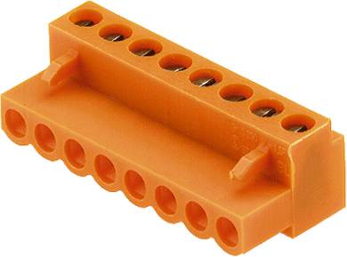 Leiterplattensteckverbinder. Buchsenstecker, 5,08 mm, Polzahl: 8, 180 °, Druckbügel-Anschluss, Klemmbereich, Bemessungsanschluss, max.: 2,08 mm², Box. 0,2 - 1,5 mm² (IEC) / 26 - 14 AWG (UL), 400 V (IEC) / 300 V (UL), 11 A (IEC) / 10 A (UL).