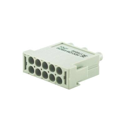 Kontakt-Einsatz. Schwere Steckverbinder, HDC - Einsatz, ConCept Modul. Bei dem CM10 Modul kommen Crimpkontakte der Baureihe HD zum Einsatz. Diese Crimpkontakte sind mit einer Edelstahlüberfeder ausgestattet. Die Überfeder hält einen Crimpkontakt sicher und auf Dauer in dem Modul. Zur Demontage der Kontakte stehen abgestimmte Kontaktlösewerkzeuge zur Verfügung. Das CM10 Modul kann mit oder ohne integrierter Modullösehilfe bestellt werden. Für ein Modul ohne integrierter Modullösehilfe steht ein Demontagewerkzeug zur Verfügung.
