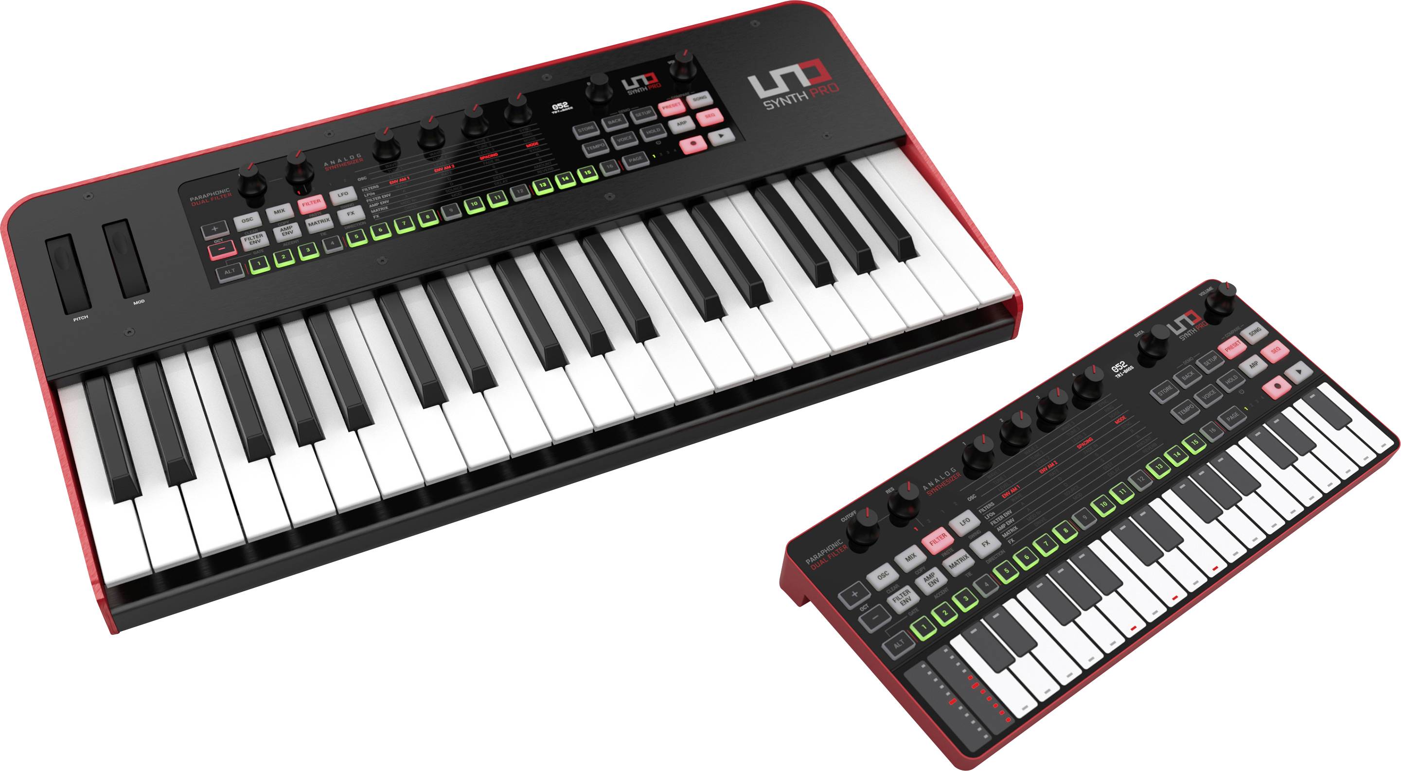 UNO Synth Pro ist erhältlich in zwei Gehäusevarianten, um allen Spielern gerecht zu werden – bühnentauglich mit robustem Metallgehäuse und Premium Synth-Action Fatar-Tastatur oder ultra-portabel, USB-betrieben mit kapazitiver Tastatur – UNO Synth Pro bietet jedem die nächste Generation des analogen Sounddesigns in einem intelligenten Format das in jeden Raum und jedes Budget passt.