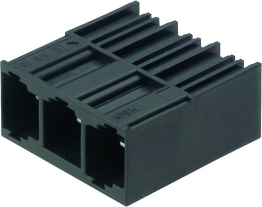 Leiterplattensteckverbinder. Stiftleiste, seitlich geschlossen, Lötanschluss, 10,16 mm, Polzahl: 3, 90 °, Lötstiftlänge: 3,5 mm, versilbert, schwarz, Box. Einreihige Hochstrom-Stiftleiste, polverlustfrei anreihbar oder mit patentiertem Flansch zur schnellen, werkzeuglosen Verriegelung. Höchste Bedienungs- und Betriebssicherheit durch 100% fehlstecksicheres Steckgesicht, einzigartige Kodiervielfalt und Zusatzbefestigung im Flansch. Stiftlänge mit 3,5 mm optimiert für den Wellenlötprozess Steckrichtung 90 °; zu den Lötstiften. 1000 V (IEC) / 600 V (UL), 76 A (IEC) / 54 A (UL).