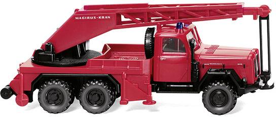 Fahrerhaus rot, Warnlichter blautransparent eingesetzt, Inneneinrichtung mit Lenkrad schwarz. Aufbau mit Drehsockel, Kranarm mit Kranausleger rot, Lasthaken, Stützrollen sowie Luftfilter und Suchscheinwerfer schwarz. Fahrgestell mit Kotflügeln und Felgen schwarz. Kühlergrillschutz rot bedruckt und Magirus-Logo auf schwarz bedrucktem Kühlergrill gesilbert. Scheinwerfer gesilbert. Seitlicher Haubenzierrat und Türgriffe gesilbert. Kranarm mit Schriftzug „Magirus Kran“ in weiß.
