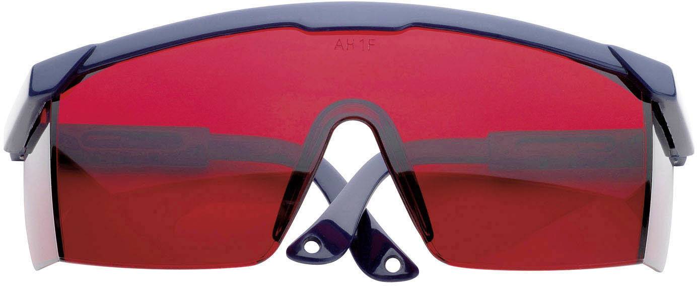 Qualitativ hochwertige Brille mit roten Gläsern für intensivierte Sichtbarkeit des Laserstrahls.