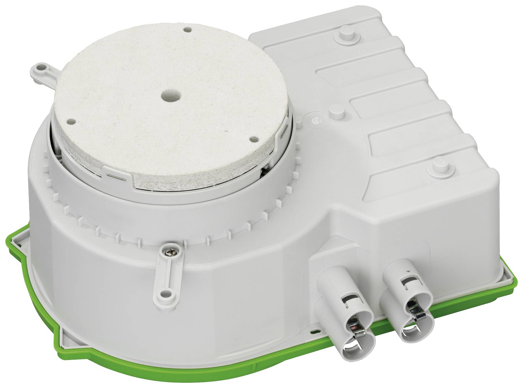 Universelles Einbaugehäuse mit zusätzlichem Anschlussraum, (z.B. zum Einbau eines elektronischen Sicherheitstransformators bis max. 150 VA) für Fertigteilbau, halogenfrei, zum Einbau von NV/HV/LED-Leuchten und Lautsprechern, geeignet für die nachträgliche Installation in Fertigteildecken von 45-70mm mittels 150mm Kernbohrung, für die Installation von VDE geprüften Leuchten nach DIN EN 60598 (VDE 0711), sowie mit F-Kennzeichnung oder MM-Kennzeichnung, maximale Einbauhöhe NV-Leuchten: 105mm, HV-Leuchten: 110mm, Lampenleistung max. 50W, Auslassöffnung wählbar: Fermacell(R)-Platte, variabel bis 100mm, 8 Kombi-Rohr-Einführungen 4 x 16mm, 4 x 19mm, integrierte Rohrstopper und Zugentlastung für Rohre 16mm, 19mm