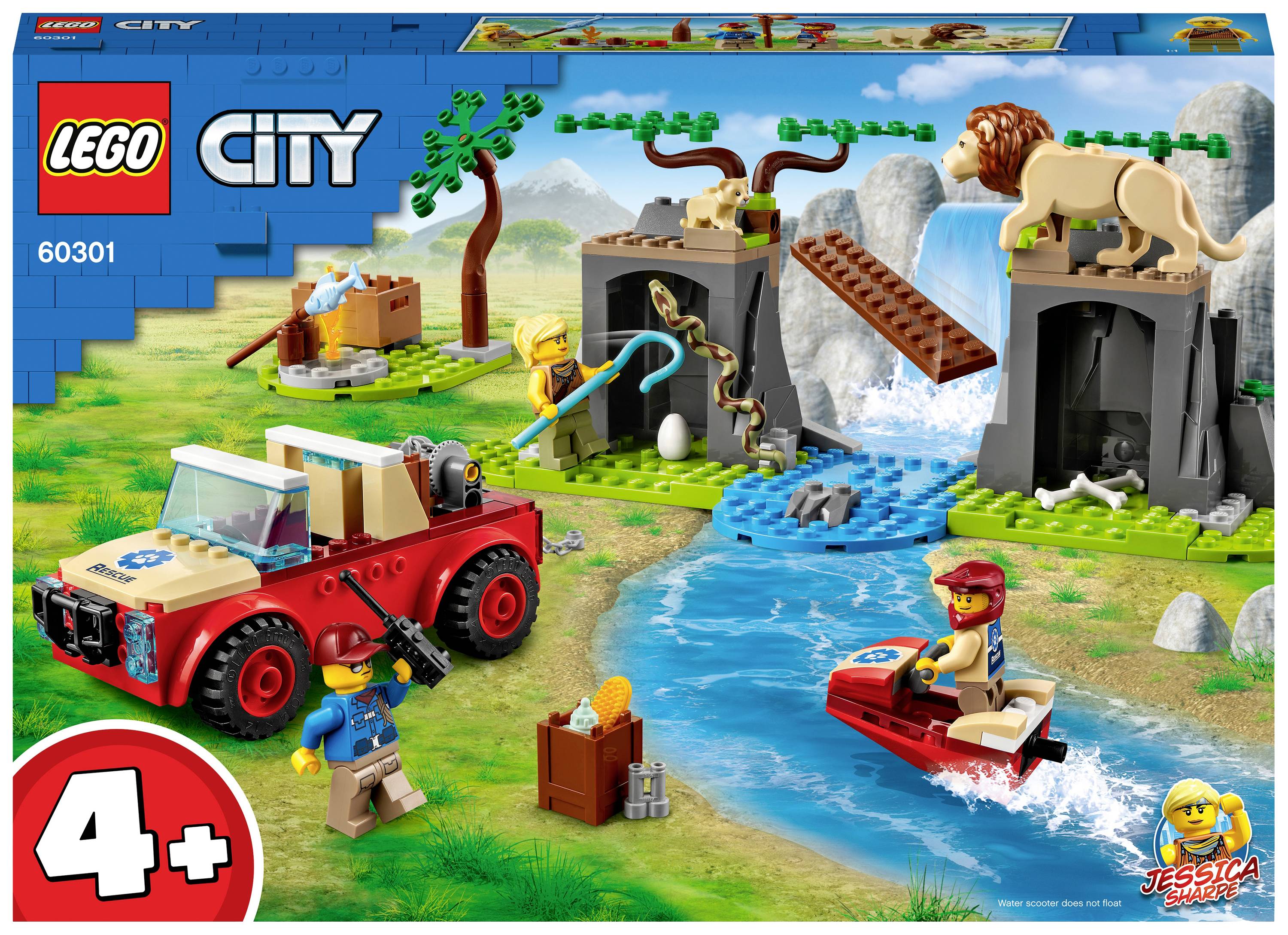 Inhalt der Box: Alles, was Kinder brauchen, um einen Geländewagen, ein Wassermotorrad und eine Savannenkulisse zu bauen. Außerdem drei Minifiguren – Jessica Sharpe, ein Wildhüter und ein Forscher – sowie ein Löwe, ein Löwenjunges und eine Schlange.