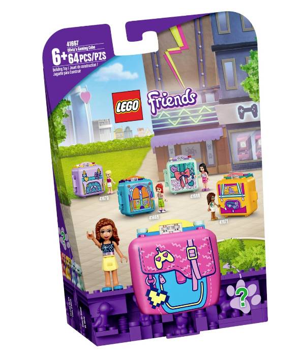 Kennst du ein kreatives Kind, das Videospiele liebt? Überrasche dein Kind mit LEGO® Friends Olivias Spiele-Würfel (41667). In diesem Spielzeug für unterwegs verbirgt sich Olivias Videospiele-Ecke. Dort befinden sich eine Spielkonsole mit Bildschirm und Controller, Lautsprecher, ein Kopfhörer und ein gemütlicher Sessel, auf dem Olivia mit ihren Freunden textet. Genau wie all die anderen Würfel beinhaltet auch dieses Set ein Tier in einer Überraschungsfarbe!Rollenspielspaß für unterwegsDas LEGO Set ist wie ein Rucksack gestaltet, damit Kinder auch unterwegs kreativ spielen können. Dieses Spielset zum Mitnehmen ist ein tolles Reisespielzeug. In die robuste Box passen alle Elemente. Steckt man sie auf der Bodenplatte fest, geht unterwegs auch nichts verloren.Lässt Freunde miteinander spielenLEGO Friends Würfel bieten viele Spielmöglichkeiten und sind tolle Geschenke für Kinder ab 6 Jahren. Die kompakten Würfel lassen sich leicht in einer Tasche verstauen und zu einem Spieltreffen mitnehmen, um mit Freunden gemeinsam zu spielen. Sie erfordern nur geringen Bauaufwand und führen Kinder langsam an das LEGO Bauerlebnis heran.