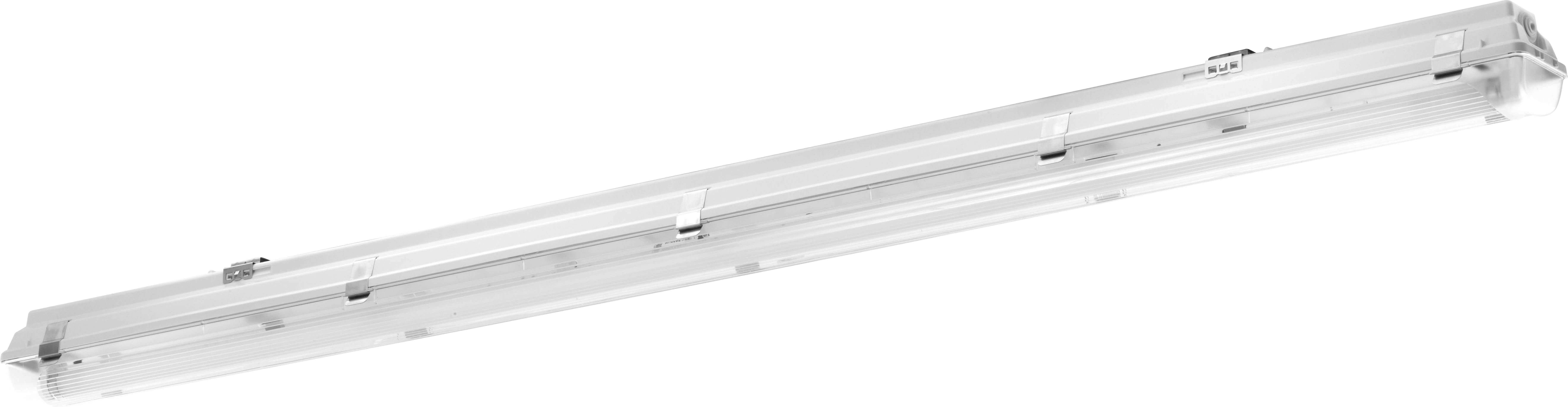 Feuchtraum Wannenleuchte für T8 LL mit Wanne aus PC, Leuchtenunterteil aus grauem, glasfaserverstärktem Polyester, rundumlaufende Silikondichtung, Lieferung inkl. Deckenbefestigungsclip, Verschluss-Clip aus rostfreiem Edelstahl, Reflektor aus Metall, weiß lackiert, Durchgangsverdrahtung mit optionalem Set möglich, mit Leitungseinführung stirn- und deckenseitig, geeignet für Deckenmontage; Pendel-, Tragschienen und waagerechte Wandmontage mit Zubehör möglich.