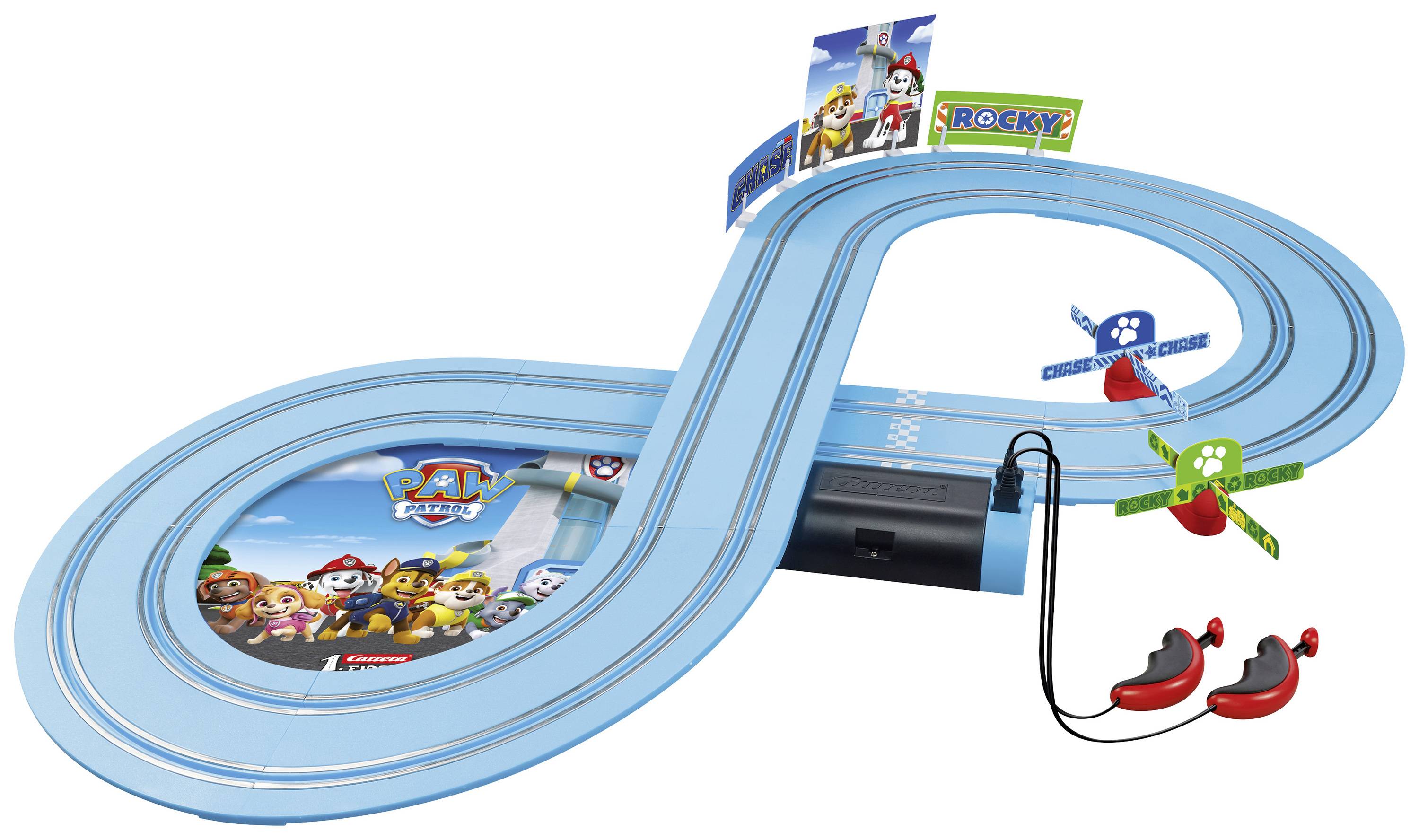 Im neuen Carrera FIRST "PAW Patrol - Ready for Action" Set starten die kleinsten Rennfahrer ab 3 Jahren in spannende Abenteuer mit den beliebten Hunden aus der Serie PAW Patrol. Hier brechen Polizeihund Chase in seinem blauen Polizeiauto und Reparaturspezialist Rocky in seinem grünen Recycling Truck zu immer neuen Erlebnissen auf. Zusammen sorgen sie für Sicherheit und Sauberkeit in den heimischen Kinderzimmern.