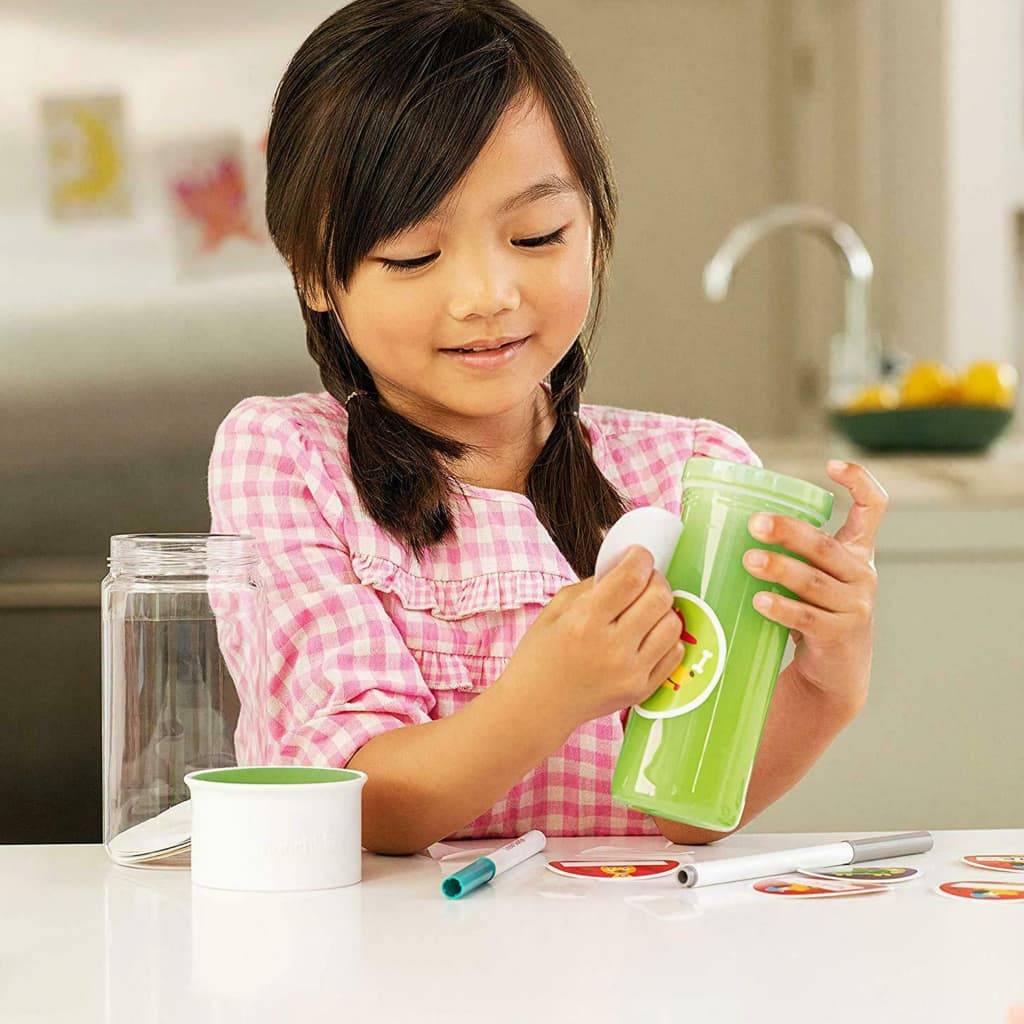 Personalisieren Sie ihn mit den Lieblingsaufklebern Ihres Kindes, um ihn perfekt zum Mitnehmen in die Schule oder Kindertagesstätte zu machen und dafür zu sorgen, dass Ihr Liebling tagsüber genug trinkt. Darüber hinaus schließt sich der auslaufsichere 360°-Deckel automatisch, wenn das Kind zu trinken aufhört. Das Design ohne Ausguss wird empfohlen, da es den normalen Muskelaufbau im Mund des Kindes fördert.
