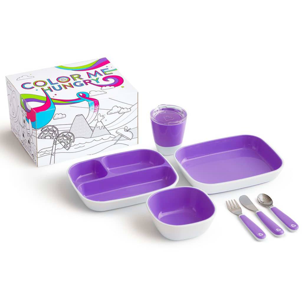 Lassen Sie Ihr Kind seine Essenszeiten mit diesem Color Me Hungry Geschirrset von Munchking genießen! Ergonomisch für kleine Münder und Hände konzipiert, unterstützt das Set selbstständiges Essen dank der bequemen, leicht greifbaren Griffe der Gabel und des Löffels sowie durch das kindersichere Messer. Die rutschfesten Böden und die tiefen Wände der Teller und der Schüssel erleichtern das Schöpfen. Ein Becher mit Übungsdeckel unterstützt selbstständiges Trinken und verringert gleichzeitig Verschüttungen. Da diese Sets in verschiedenen Farben erhältlich sind, eignen sie sich perfekt zur Farbkodierung in Haushalten mit mehreren Kindern. Dieses Set ist auch als Geschenk perfekt geeignet, da es in einer Geschenkbox mit einer Einhorn-Ausmalunterlage geliefert wird. Farbe: Violett Material: Kunststoff BPA-frei Spülmaschinenfest Rutschfeste Unterseiten Empfohlenes Alter: ab 18 Monate Verpackt in Geschenkbox Lieferung beinhaltet : 1 x geteilter Teller 1 x flacher Teller 1 x Schüssel 1 x Becher mit Übungsdeckel 1 x Gabel 1 x Messer 1 x Löffel