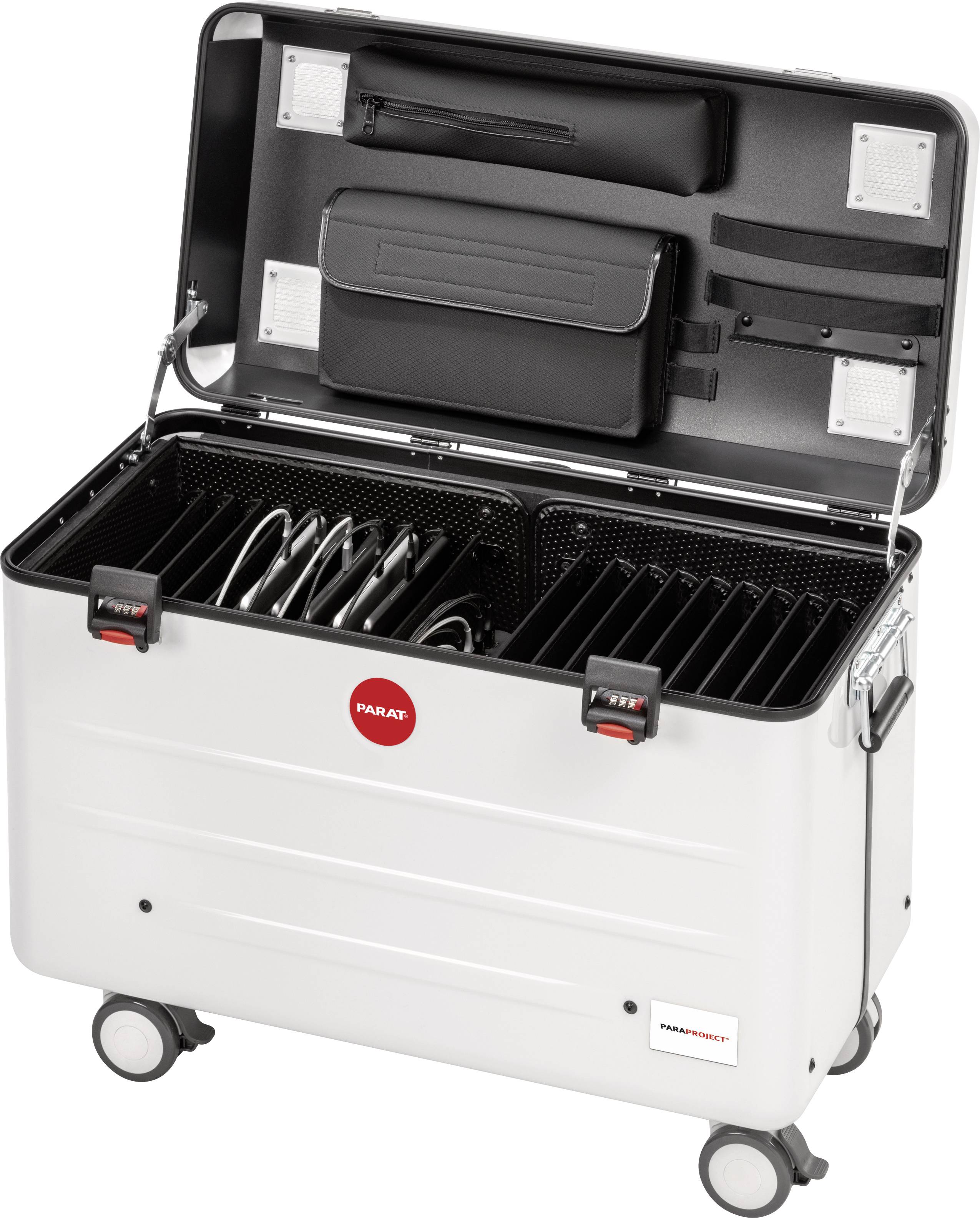 Der PARAPROJECT® Case TC20 ist die sichere Transport- und Aufbewahrungslösung Nummer 1 für bis zu 20 iPads® sowie andere Tablets bis 12,9‘‘. Ganz gleich, ob Sie Modelle mit iOS-, Android- oder Windows-10-Betriebssystem im Einsatz haben. Die integrierten und innovativen TwinCharge Module ermöglichen das unkomplizierte und schnelle Laden aller Geräte durch USB-A und USB-C®-Anschlüsse mittels USB-PD (Power Delivery) und QuickCharge. Die Einschubfächer sind aus ebenso leichten wie formstabilen „Con-Pearl®“-Kunststoffwaben gefertigt. Dank der im Deckel und Boden integrierten Öffnungen kann die Luft im Case optimal zirkulieren. Ein außen angebrachter Hauptschalter und ein Überspannungsschutz bieten die nötige Sicherheit im täglich Einsatz. Mit zwei Zahlenschlösser versehen und seiner weißen UV-beständigen Außenschale aus 3 mm starkem ABS-PMMA Kunststoff zeichnet sich der Systemkoffer darüber hinaus durch einen sicheren Rundumschutz aus. Die glatte Oberfläche eignet sich bestens, um den Case durch ein eigenes Label zu individualisieren. Vier Leichtlaufräder, davon zwei mit Radfeststellern, der 4-fach Trolley-Teleskopauszug und zwei seitlich angebrachte Tragegriffe sorgen für bequemes und sicheres Handling. Zudem überzeugt der PARAPROJECT® Case TC20 durch diversere Fächer und Taschen, die im Kofferdeckel eingearbeitet sind.