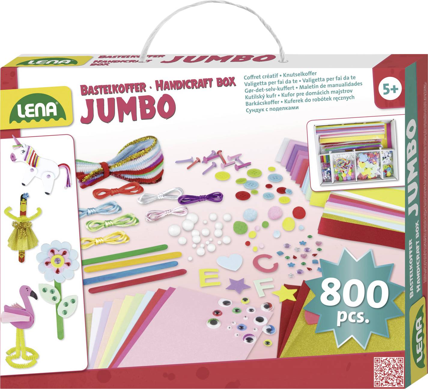 LENA® Bastelkoffer Jumbo pink enthält rund 20 verschiedene hochwertige Bastelmaterialien, wie z.B. glitzernde Strassteine, Knöpfe, buntes Papier, Moosgummiteile, Pfeifenreiniger, Wackelaugen, Pompons, bunte Eisstiele, Styroporkugeln, Bänder und vieles mehr in verschiedenen Pastell-Farbtönen. Insgesamt bietet der Koffer 800 Teile. Geeignet für Kinder ab 5 Jahren. Verpackt in buntem Kartonkoffer mit Produktinformationen.