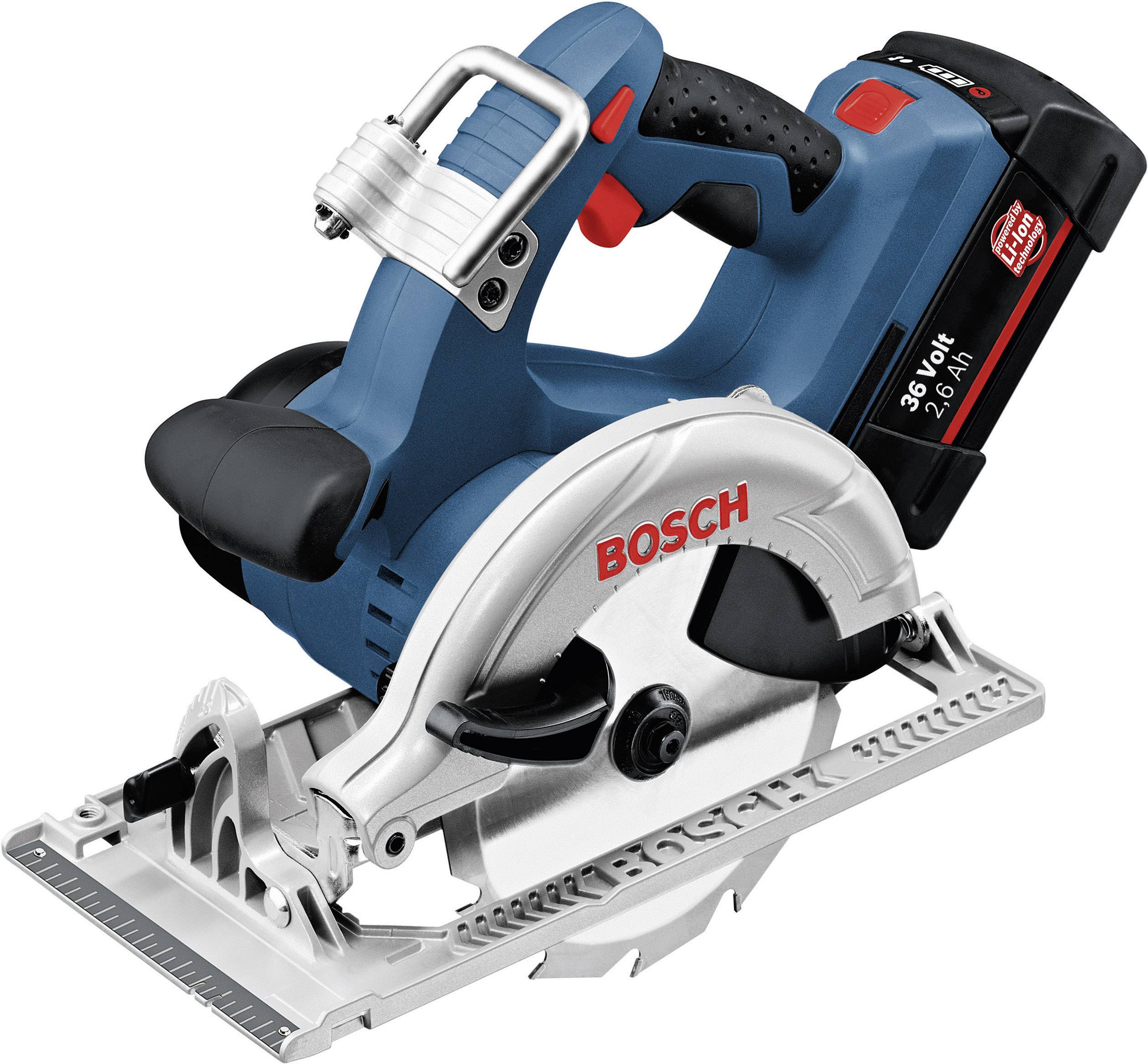 Akku-Kreissäge GKS 36 V-LI, durchzugsstark wie ein Netzgerät, stark wie ein Netzgerät: bis zu 95 Spanplatten (900 x 19 mm) ablängen mit nur einer Akkuladung, mobiles Kraftpaket: Schafft Schnitte bis 54 mm Tiefe, praktisch: die innovative Aufhängevorrichtung hält die Kreissäge immer griffbereit, einzigartige Bosch-Premium-Lithium-Ionen-Technologie für längere Lebensdauer und unschlagbare Akkulaufleistung, Bosch Electronic Cell Protection (ECP): schützt den Akku vor Überlastung, Überhitzung und Tiefentladung, stufenlose Schnitttiefeneinstellung durch Schnellspannhebel, kein Memory-Effekt: der Akku kann unabhängig vom Ladezustand jederzeit geladen werden, ohne die Zellen zu schädigen, Handwerkerkoffer, HM-Sägeblatt 165 mm Durchmesser (2 608 640 788), Schnellladegerät AL 3640 CV (2 607 225 100), Parallelanschlag, 2 x 2,6 Ah Li-Ion Akku (2 607 336 108)