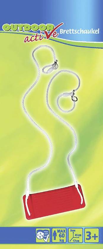 Outdoor active Brettschaukel aus hochwertigem und wetterfestem Kunststoff. Ausgestattet mit starken Kunststoffseilen, die durch verzinkte Eisenringe und Stellachten in der Höhe verstellt werden können. Seillänge ca. 180cm. Maximale Belastung ca. 60kg. Maße ca. 42x16cm. Für Kinder ab 3 Jahren.