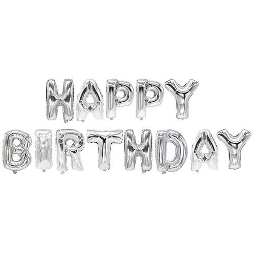 Ballon-Set "Happy Birthday" aus PET-Folie - bestehend aus Einzelbuchstaben - Farbe: silber - Größe: 35 cm hoch - Mit selbstschließendem Ventil - Lassen sich problemlos wieder befüllen - Geeignet für die Befüllung mit Luft.