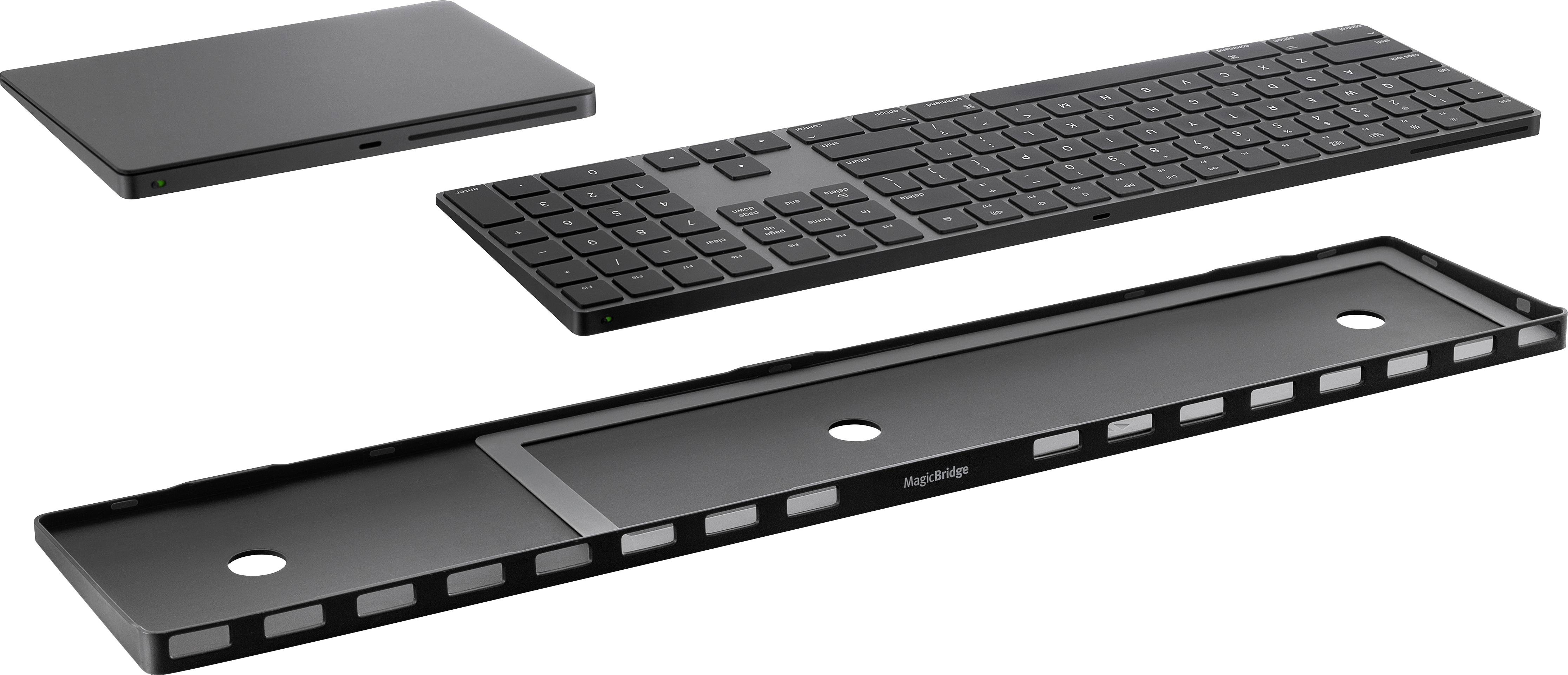 MagicBridge ist eine flache Schale, die das Keyboard mit dem Trackpad einfasst und zusammenhält. Das Resultat ist eine stabile Einheit und ein effizientes Arbeitsgerät. Das Magic Trackpad 2 kann links oder rechts an dem Wireless Keyboard positioniert werden.