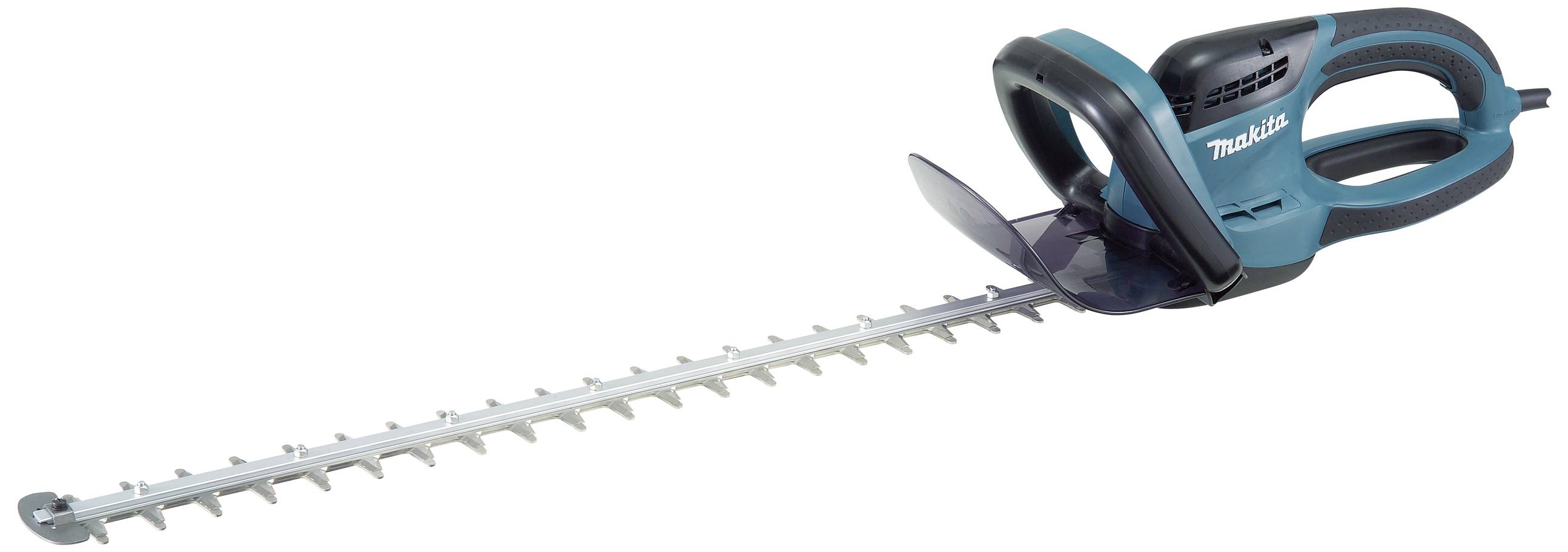 Eine 670 W Elektro-Heckenschere mit einem 75 cm Messerbalken für die Gartenpflege. Der Zweihand-Sicherheitsschalter bietet zusätzliche Sicherheit und das Gerät hat einen niedrigen Geräuschpegel.