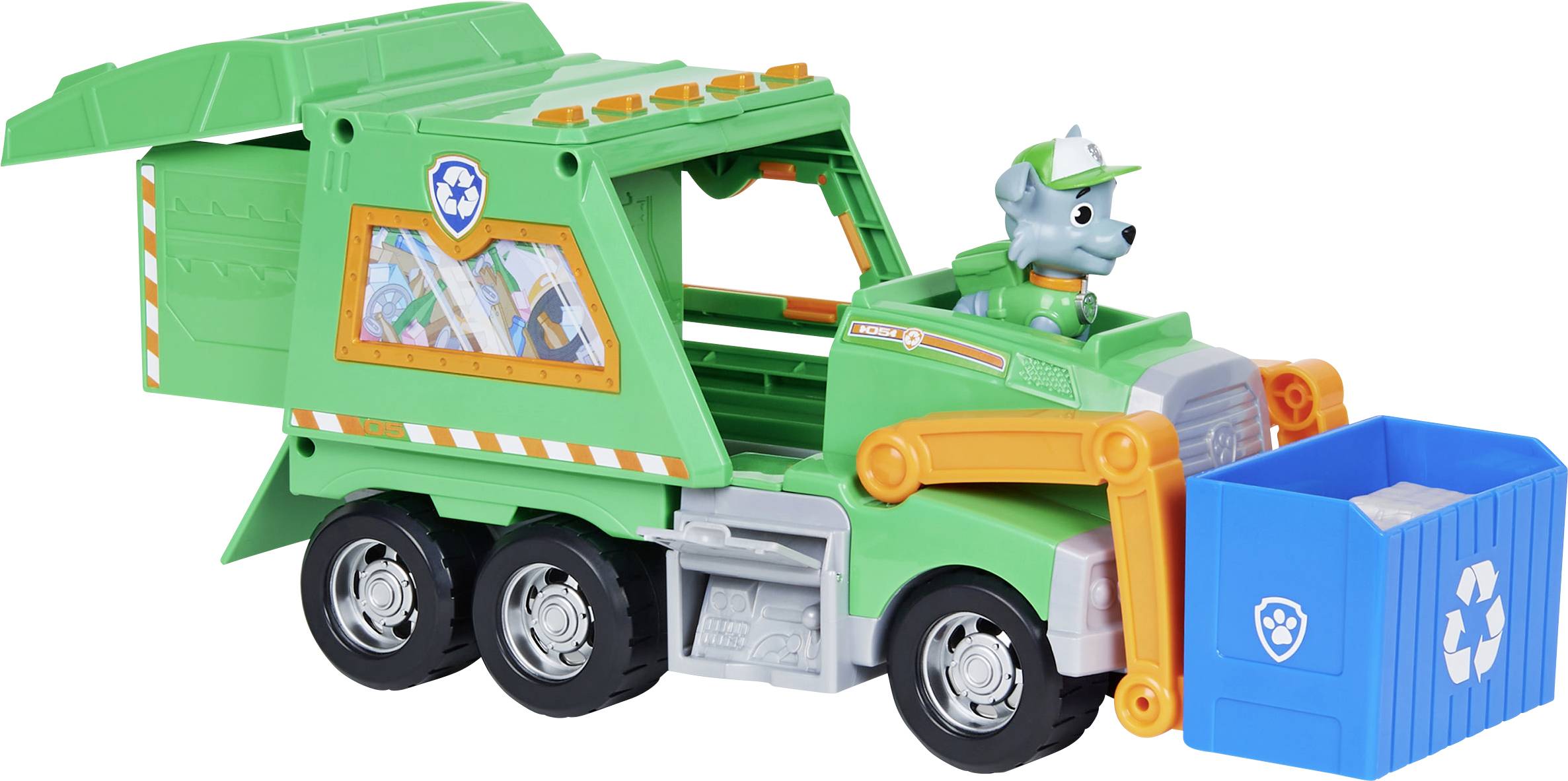 Nicht entsorgen, sondern weiterverwenden. Mit Paw Patrol-Mitglied Rocky und seinem Recyclinglaster kann man Materialien in Werkzeuge verwandeln und so zum Helden des Tages werden. Rockys Recycling-Truck mit freidrehenden Rädern und Gabelstapler-Funktion ermöglicht viele Missionen. Einfach Rocky hinter das Lenkrad setzen und in den Straßen von Adventure Bay nach Materialien zum Recyceln suchen. Müllcontainer auf die Staplerarme nehmen, den Laster mit Metallwürfeln (zwei enthalten) beladen und sie in etwas Neues verwandeln. Wenn man den Hebel am LKW nach unten drückt, heben sich die Lastarme und man sieht, wie der Müllcontainer die Würfel in Rockys Truck leert, genau wie bei einem echten Recyclinglaster. Verschiebt man den Knopf an der LKW-Seite, ist das Seitenfenster die Müllpresse zu sehen. Die Metallwürfel werden zu drei praktischen Werkzeugen recycelt, die sich nach Absetzen des Müllcontainers an den Lastarmen befestigen lassen, zwei sind kombinierbar. Mit der Bürste kann man die Straßen fegen, mit der Kralle Müll aufsammeln und mit dem Hammer Reparaturen durchführen. Für noch mehr Spielspaß lassen sich sogar die Arme drehen. Nach der Mission einfach das Dach des Lasters abnehmen und Werkzeuge und Metallwürfel darin verstauen. Mit den anderen Welpen und ihren Rettungsfahrzeugen (jeweils einzeln erhältlich) lassen sich zuhause noch mehr Paw Patrol-Abenteuer erleben. Rocky und sein Truck sorgen für den Recycling-Spaß.