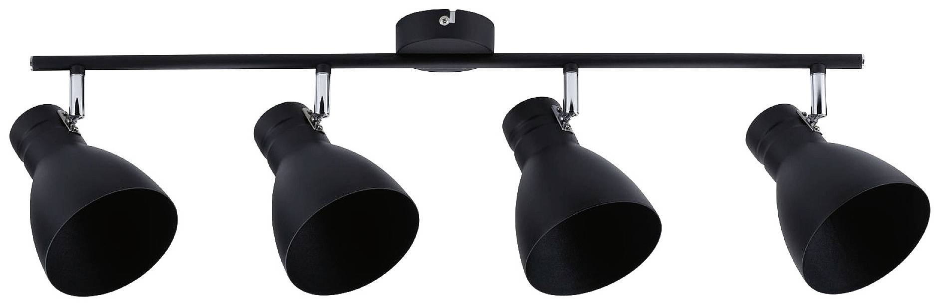 Das vierflammige Spotlight der Serie Davy in der Farbe Schwarz eröffnet vielfältige Einsatzmöglichkeiten und fügt sich mit seinem schicken Trenddesign im Industrielook nahtlos in jede Wohnsituation ein. Das Leuchtmittel ist frei wählbar. Es lassen sich beliebige Leuchtmittel mit E27-Sockel und einer Leistung von maximal 10 Watt einsetzen.