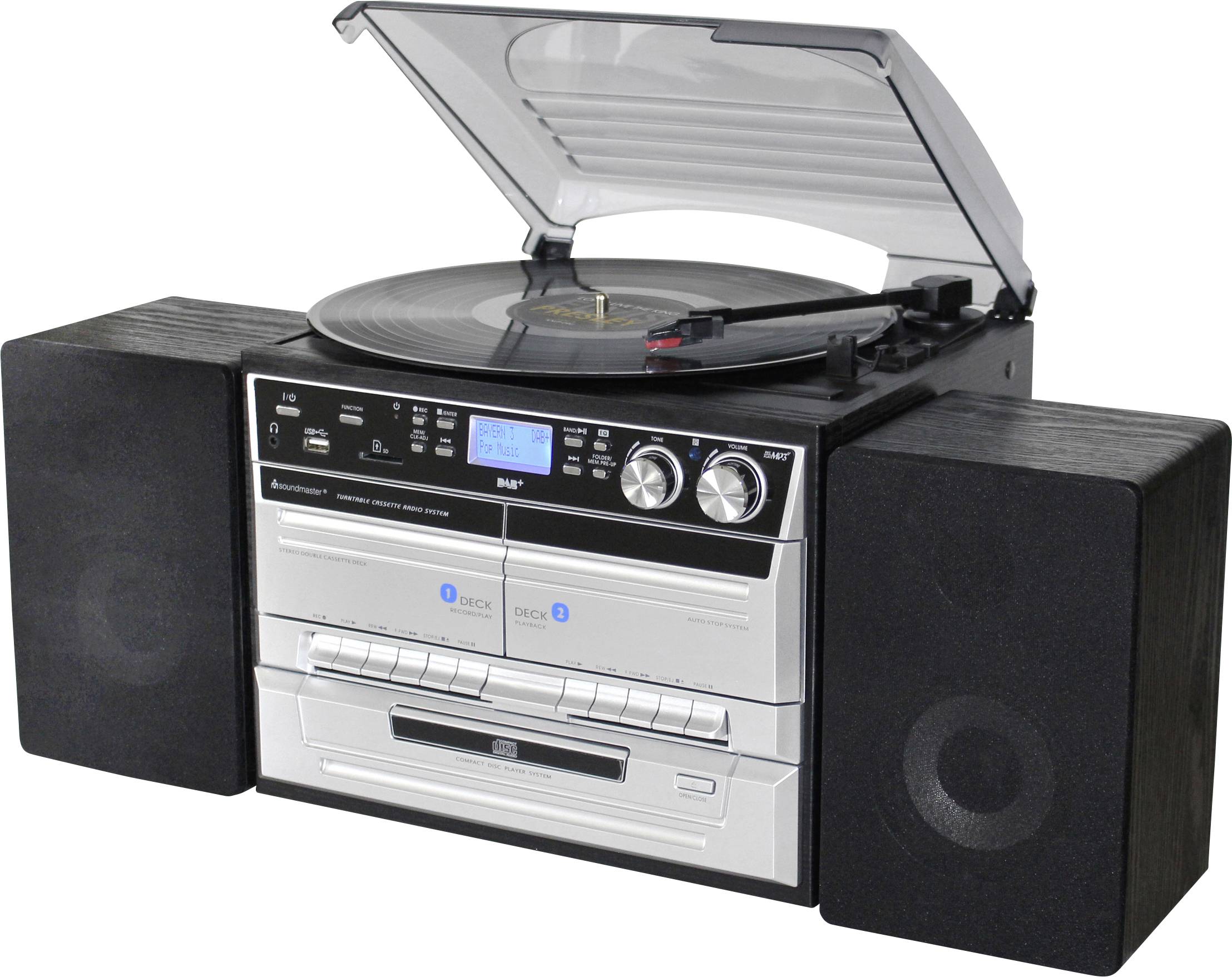 Encoding = Aufnahme von Platte, Radio, CD und Kassette auf USB oder SD/MMC Karte · Doppel Kassetten-Deck mit Aufnahmefunktion · Kopfhörerbuchse und Line-Out · 75 ohm Antennenanschluss und DAB/UKW Antenne beiliegend · Fernbedienung · Ausgangsleistung: 2 x 4 Watt RMS