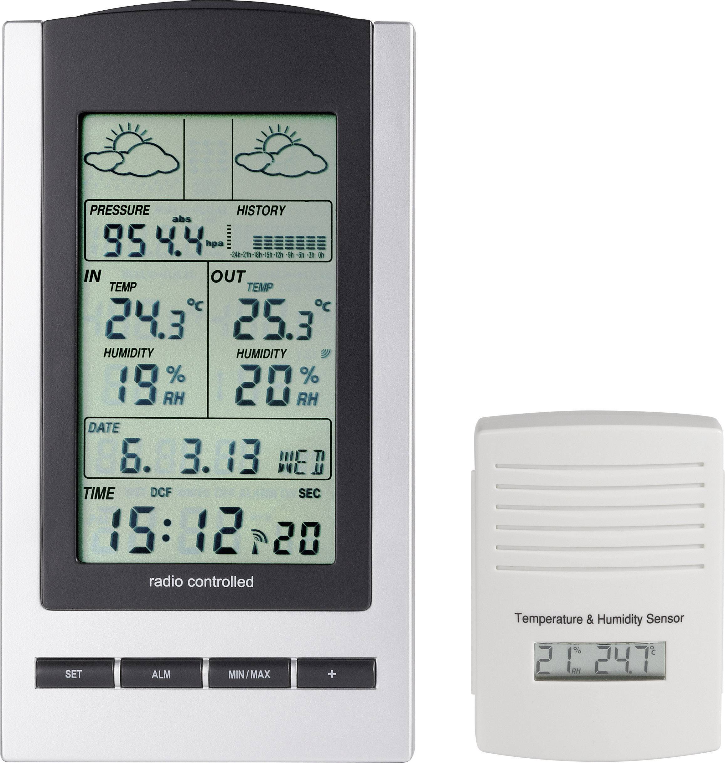 Funk-Uhr (manuelle Einstellung möglich) · Einstellung der Zeitzone möglich (-12 bis +24 h) · Datum · 12/24 h-Anzeige · Alarm · 5 x 5 Min. Weckwiederholung · °C/°F-Anzeige · Anzeige des Luftdrucks (absolut und relativ) · hPa/inHg-Anzeige · Grafische Darstellung des Luftdruckverlaufs der letzten 24 Stunden · Max-/Min-Speicher · Taupunkt-Temperatur · Alarmsignal bei Über- oder Unterschreiten einer einstellbaren Temperatur, der Luftfeuchte oder des Luftdrucks · Einstellbare Unwetter-Warnung (3 bis 9 hPa) · Symbole für Wettervorhersage der nächsten 12 - 24 Stunden · Tischaufstellung oder Wandmontage möglich · Displaybeleuchtung mit LEDs · Außensensor mit Anzeige der Temperatur und Luftfeuchte über integriertes LC-Display.