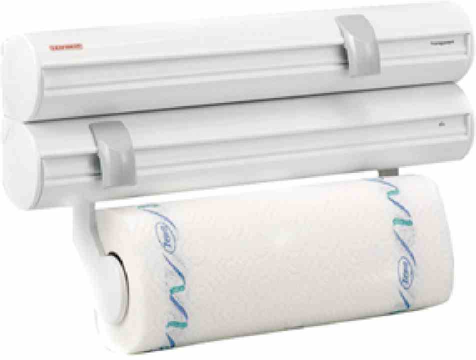 Halterung fur eine Küchentuchrolle sowie zwei geschlossene Behälter für Alu- und Frischhaltefolien