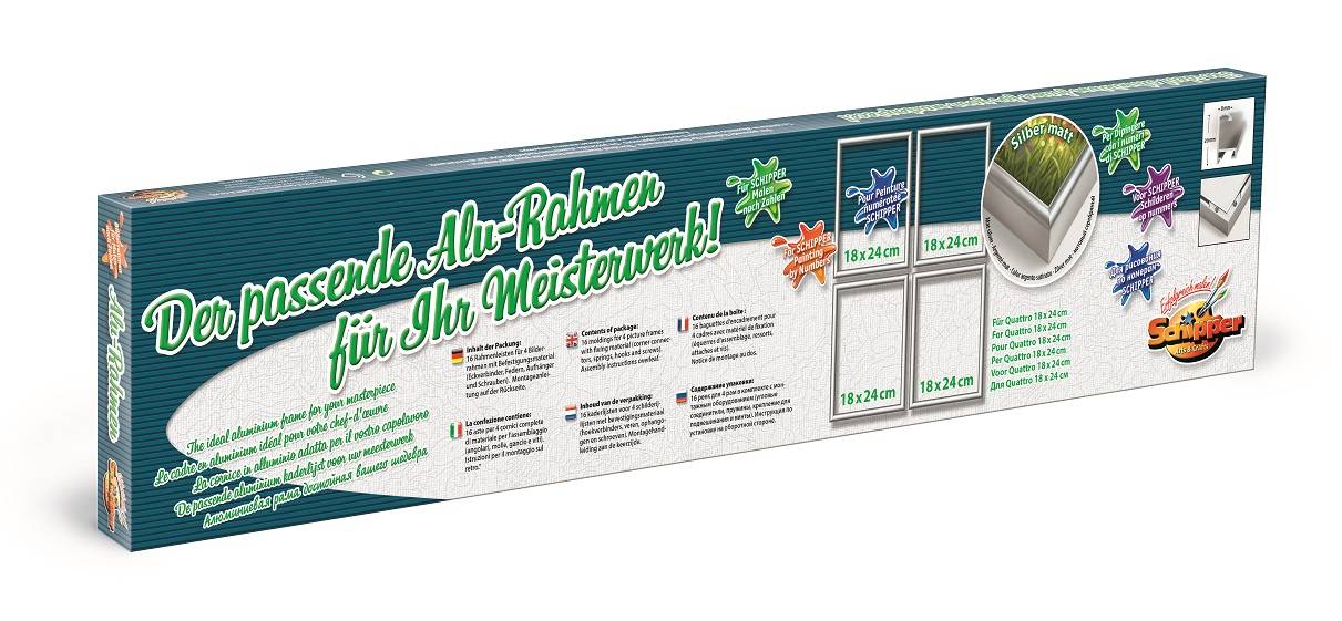 Alurahmen Quattro 18 x 24 cm – Silber matt Der passende Alu-Rahmen für Ihr Meisterwerk! Jedes Gemälde kommt erst dann richtig zur Geltung, wenn es schön gerahmt ist. Die Auswahl eines passenden Rahmens ist bei der großen Auswahl sehr schwer. SCHIPPER Arts & Crafts hat einen Alurahmen ausgesucht, der nicht nur zu allen Malen-nach-Zahlen-Motiven, sondern auch zu jeder Wohnungseinrichtung passt. Der eloxierte Rahmen mit seinem schmalen Profil verleiht dem Gemälde Ausdruckskraft und umrahmt es in dezenter Weise. Die Rahmen werden in einzelnen Rahmenleisten zur problemlosen Selbstmontage geliefert. Jede Packung enthält das erforderliche Befestigungsmaterial mit einer Montageanleitung. Inhalt der Packung: 16 Rahmenleisten für 4 Bilderrahmen Quattro 18 x 24 cm mit Befestigungsmaterial (Eckverbinder, Federn, Aufhänger und Schrauben), Montageanleitung. Achtung! Nicht für Kinder unter 3 Jahren geeignet. Es besteht Erstickungsgefahr wegen verschluckbarer Kleinteile!
