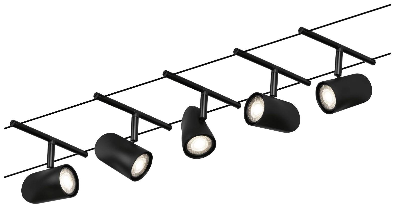 Die Serie Cup in Schwarz matt#Chrom mit 5 Spots ohne Leuchtmittel kann sowohl an der Wand als auch an der Decke montiert werden und bietet dadurch grenzenlose Gestaltungsmöglichkeiten. Egal ob gerade, schräg oder verwinkelt - Seilsysteme passen in jeden Raum und sind die Problemlöser für schwierige Installationsbedingungen. Das Basisset lässt sich individuell durch Einzelspots, Umlenker und weiteres Zubehör ergänzen. Das Seil mit einer Länge vom 10 m, kann in der Mitte geteilt werden, sodass das System auf max. 5 m gespannt werden kann. Mit diesem System lässt sich eine optimale Lichtverteilung realisieren, bei steigendem Lichtbedarf lässt es sich problemlos erweitern. Für die Verteilung der Leuchten im gesamten Raum wird nur ein Stromauslass benötigt. Systeme mit der Technik 12V DC (Gleichspannung) lassen sich nicht über einen Wand-Einbaudimmer dimmen.