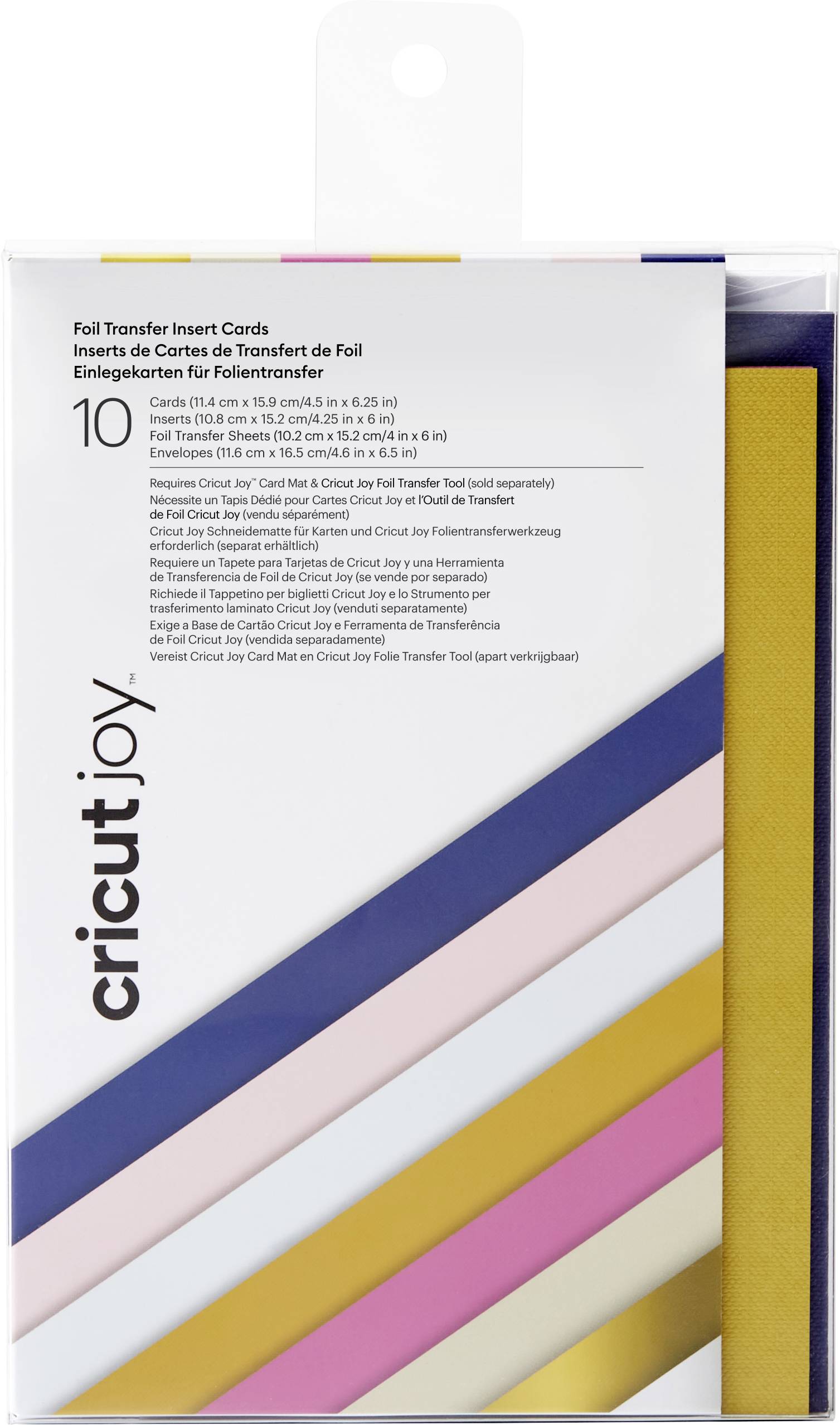Verleihen Sie Ihren Cricut Joy™ Einsteckkarten in wenigen Minuten ein wenig Schimmer und Glanz durch Folientransfer. Ohne den Einsatz von Klebern erstellen Sie unkompliziert zweifarbige Karten mit Tiefenfüllung. Kombinieren Sie die Karten mit dem Cricut Joy Foil Tranfser Tool (separat erhältlich) und den mitgelieferten Transferfolien zu einem einzigartigen Ergebnis. Dieses Set enthält weiße Umschläge, Karten und Einsteckkarten in verschiedenen Farben sowie Foil Transferfolien in Gold und Silber. Zur Verwendung mit dem Cricut Joy. Benötigt das separat erhältliche Cricut Joy Foil Transfer Tool und die separat erhältliche Cricut Joy Kartenschneidematte.