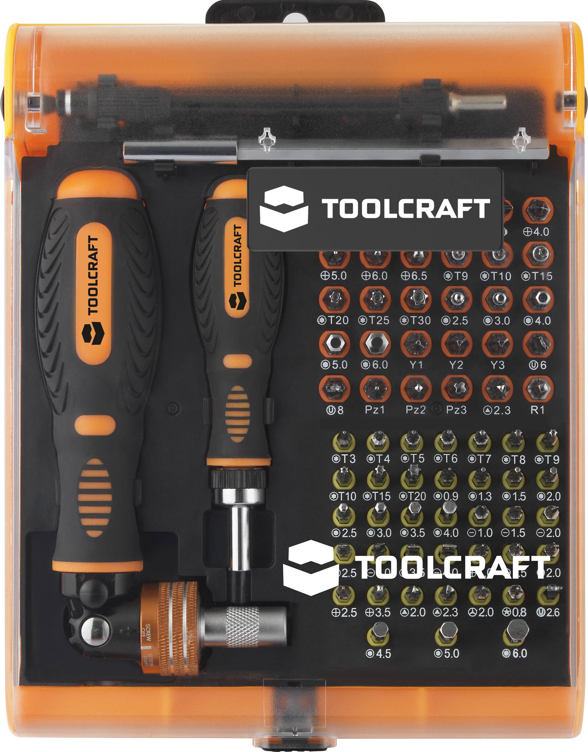CR-V Bits (4 mm): + SL: 1,0 1,5 2,0 2,5 3,0 3,5 4,0 PH:1,0 1,5 2,5 2,0 3,5 T-Profil: T3 T4 T5 T6 T7 T8 T9 T10 T15 T20 HEX: H0,9 H1,3 H1,5 H2,0 H2,5 H3,0 H4,0 H4,5 H5,0 H6,0 U: U2,6 + Pentalobe (Stern) 0,8 DREIECK: 2,0 2,3 + TIR-WING: 2,0 CR-V-Bits (6,3 mm): + SL: 3,0 4,0 5,0 6,0 7,0 + PH: 4,0 5,0 6,0 6,5 + T-Profil: T9, T10, T15, T20, T25, T30 + HEX: H2,5 H3,0 H4,0 H5,0 H6,0 + PZ: Pz1, Pz2, Pz3 U: U6, U8 Y: Y1, Y2, Y3 + Dreieck: 2.3 Qadr.: R1 + Weiche Verlängerungsstange: H4 x 130 mm + Verlängerungsstange: H6,3 x 125 mm, H4 x 100 mm + Schraubendreher x 1 (6,3 mm, mit einstellbarem Winkel, mit Richtungssteuerung: "screw off / screw tight" (Schraube lockern / Schraube anziehen) + Schraubendreher x 1 (4,0 mm, mit Richtungssteuerung: "screw off / screw tight" (Schraube lockern / Schraube anziehen)