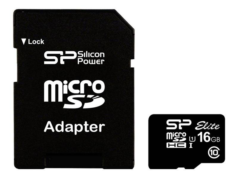 Silicon Power Elite. Kapazität: 16 GB, Flash Card Typ: MicroSDHC, Flash-Memory-Klasse: Klasse 10, Interner Speichertyp: UHS-I, Lesegeschwindigkeit: 85 MB/s, UHS Speed Klasse: Class 1 (U1). Schutzfunktion: Schockresistent, Wasserdicht, Produktfarbe: Schwarz