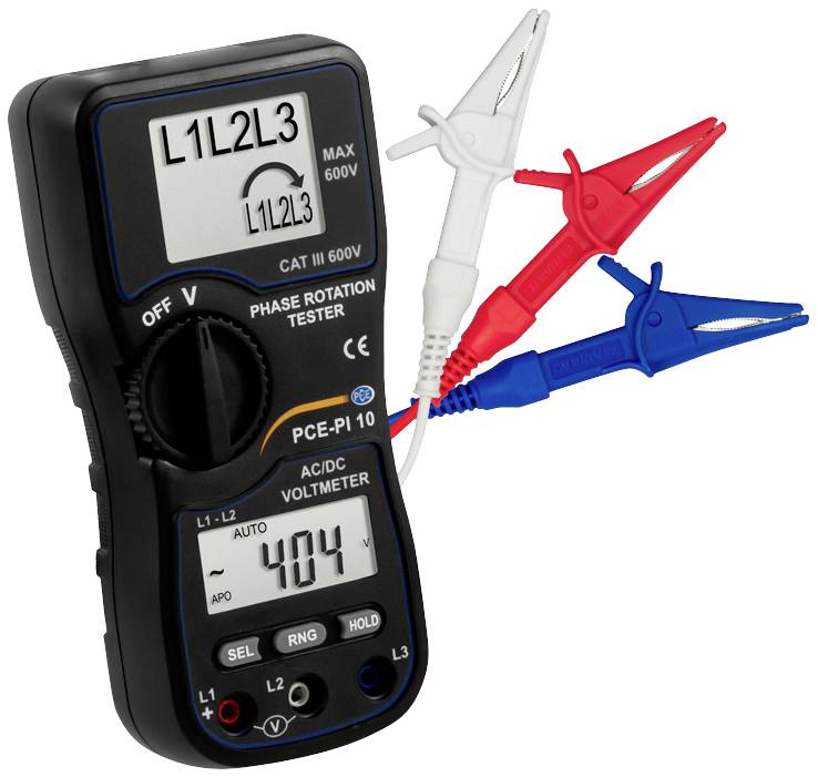 Drehfeldtester PCE-PI 10 Drehfeldanzeiger mit Spannungstester / zwei LC-Displays / Spannungsmessung bis 600 V Messleitungen mit Krokodilklemmen Der Drehfeldanzeiger PCE-PI 10 wird verwendet um die Drehrichtung von 3-phasigen Spannungsnetzen zu bestimmen. Weiterhin ist der Drehfeldanzeiger in der Lage Spannungen bis 600 V AC/DC zu messen. Die Drehfeldrichtung ist wichtig an Maschinen und Anlagen. Werden die Phasen nicht richtig angeschlossen, können zum Beispiel Schäden an angeschlossenen Motoren und Pumpen entstehen. Der Drehfeldanzeiger stellt die Drehrichtung auf einem LC-Display dar. Weiterhin zeigt das Display vom Drehfeldanzeiger an, ob an den Messleitungen eine Phase angeschlossen wurde oder nicht. Die Messleitungen vom Drehfeldanzeiger sind mit Krokodilklemmen ausgestattet, damit das Messgerät direkt an Leitungen oder Schraubkontakte angeschlossen werden kann.
