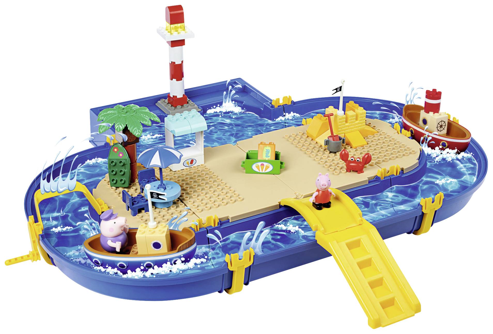 Die große Wasserbahn mit einem Hafenbecken und breiten Kanälen aus UV-beständigem Kunststoff wird zum nächsten Abenteuer von Peppa und ihrem Großvater. Das Peppa Pig Holiday Set ist einfach zu montieren und sorgt durch perfekt gestaltete Dichtungen für ein wasserdichtes Spielerlebnis inkl. Wasserkurbel.
