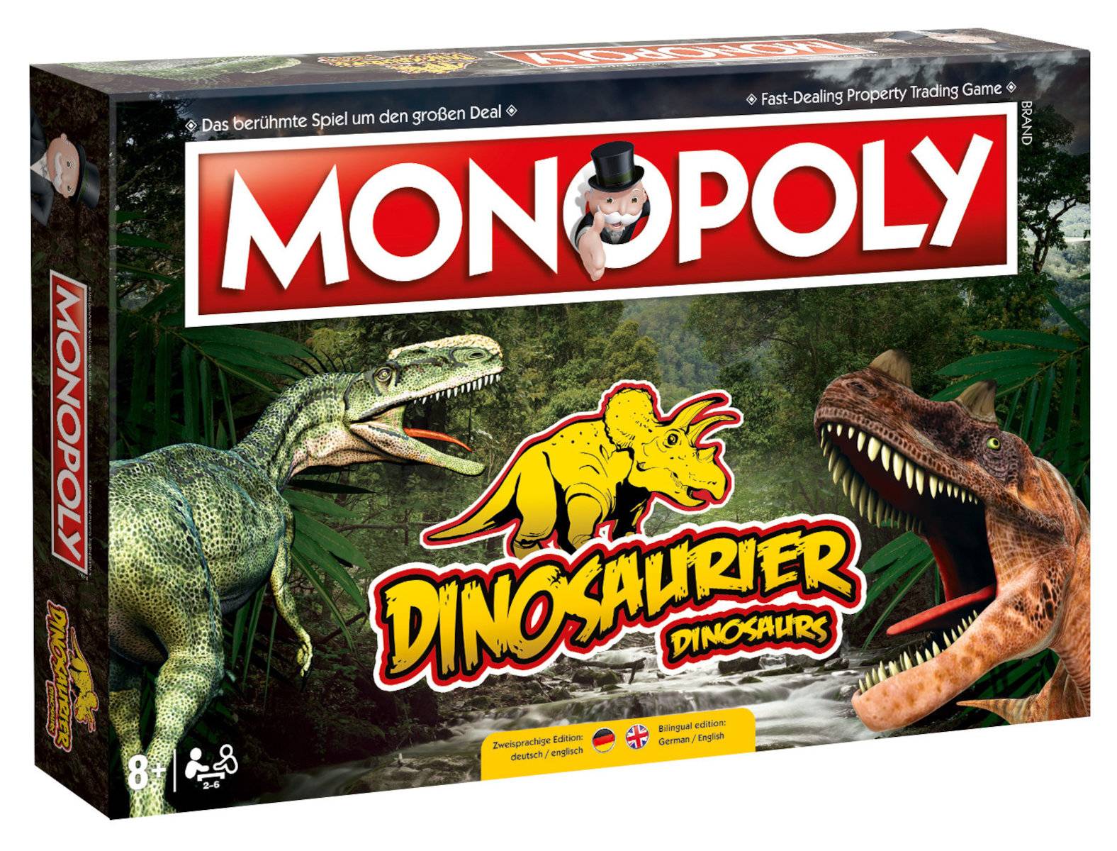 Sich an Pflanzen sattfressende Giganten, die sich ihren Weg durch unberührte Natur bahnen, tyrannische Vertreter, die immer auf der Jagd nach ihrer nächsten Beute sind und fliegende Herrscher der Lüfte, die über all dem kreisen. Die Welt der Dinosaurier ist so vielfältig wie faszinierend. Und genau deshalb gebührt ihr ein eigenes Monopoly in der Dinosaurier Edition. Begebt euch mit 2-6 Spielern auf die spannende Expedition und schlüpft in die Rolle eines vielbeschäftigten Paläontologen. Fossilien, Skelette, Zeitalter und Theorien warten darauf, von euch erkundet zu werden. Hinterlasst Jeeps und Zelte auf eurer Reise, kassiere Miete, mach Geschäfte mit anderen Wissenschaftlern und erkundet Ausgrabungsstätten und Labore. Doch bleibt aufmerksam – denn nur einer kann der Beste sein. Wer wird es schaffen?