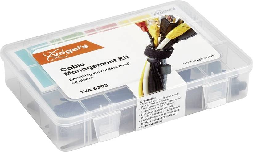 Das TVA 6203 Set von Vogel's enthält ganze 40 Artikel: 12 Kabelbinder (6 Stück mit einer Länge von 120 mm und 6 Stück mit einer Länge von 180 mm); 6 selbstklebende Kabelhalter (3 Stück für 1 Kabel und 3 für 3 Kabel); 8 Klettbänder (4 Stück je 120 x 5 mm und 4 je 300 x 20 mm); 6 selbstklebende Kabelbinder-Montageblöcke (3 Stück je 19 x 19 mm und 3 je 23 x 23 mm); 8 Kabel-Markierungen in verschiedenen Farben.